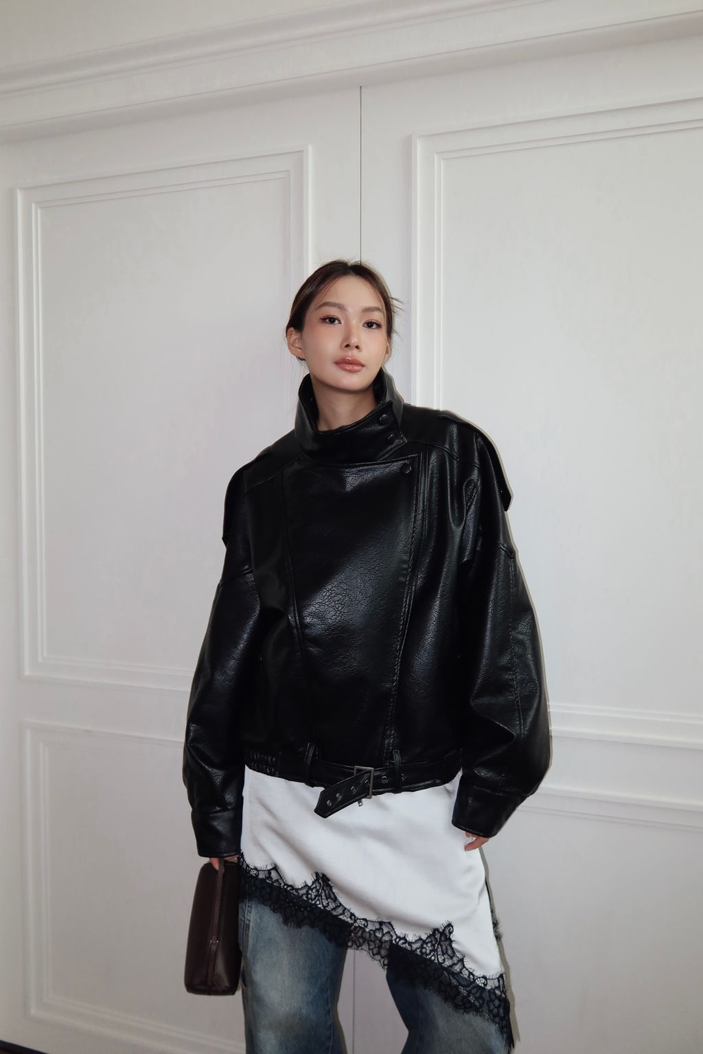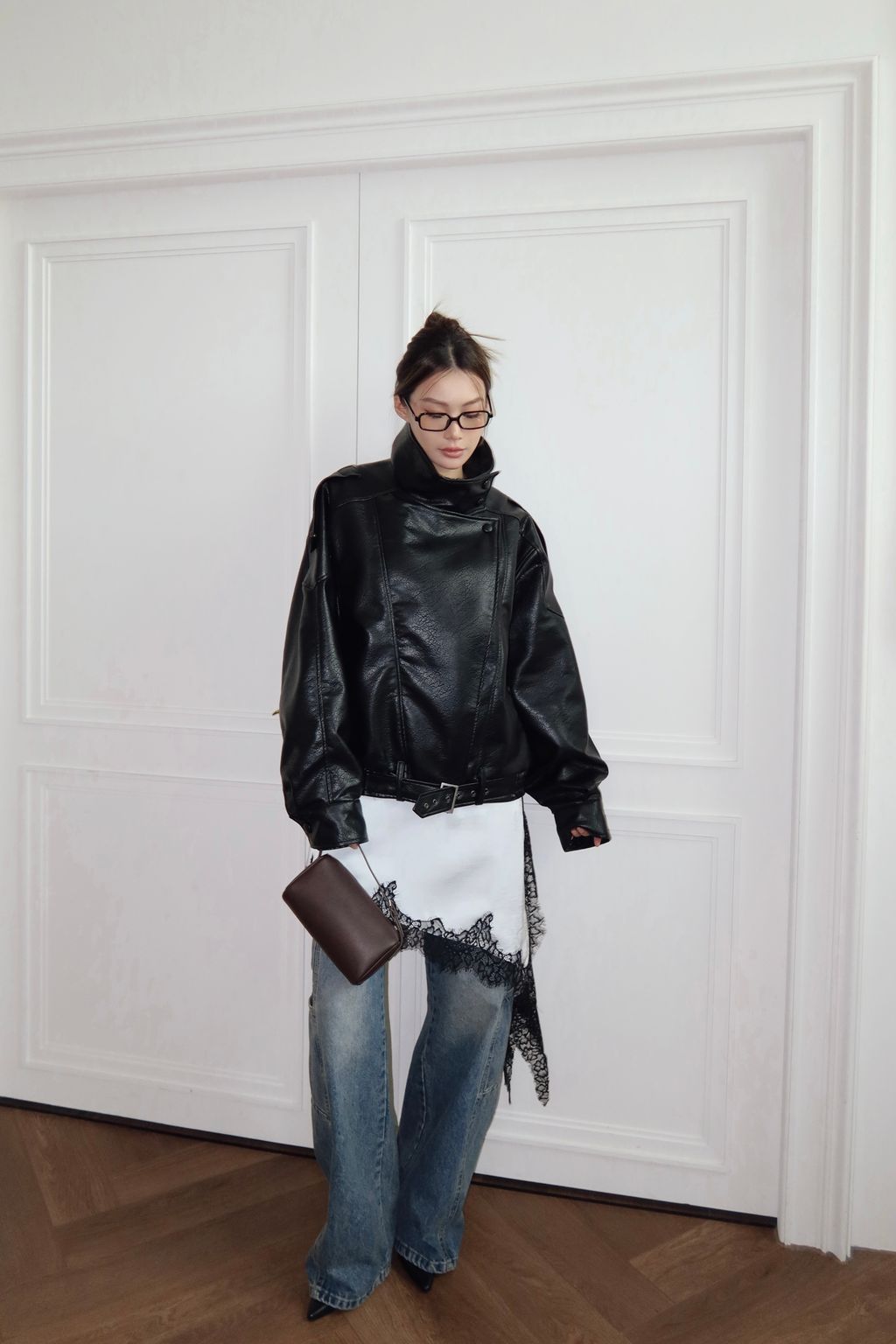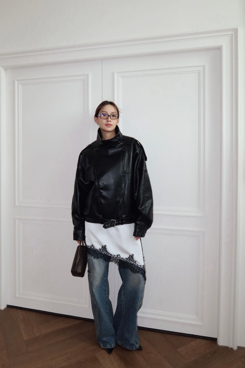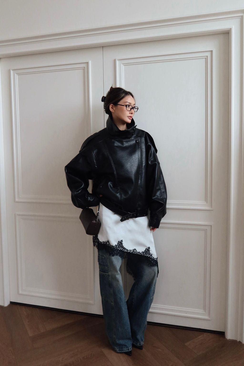 ・不對稱翻領、金屬釦、側拉鍊,搶眼卻不浮誇