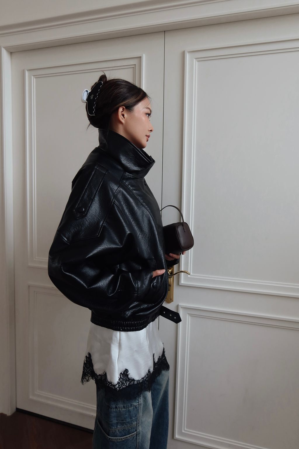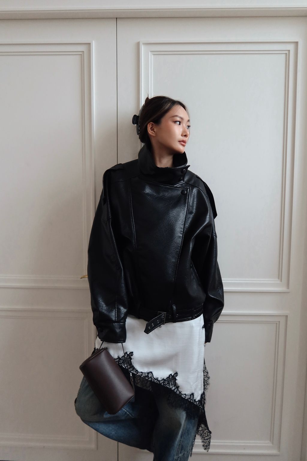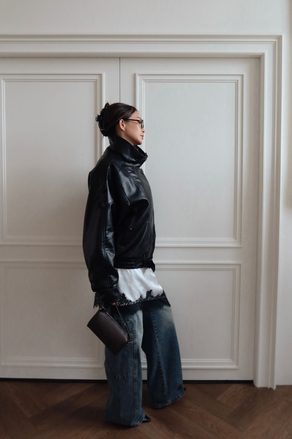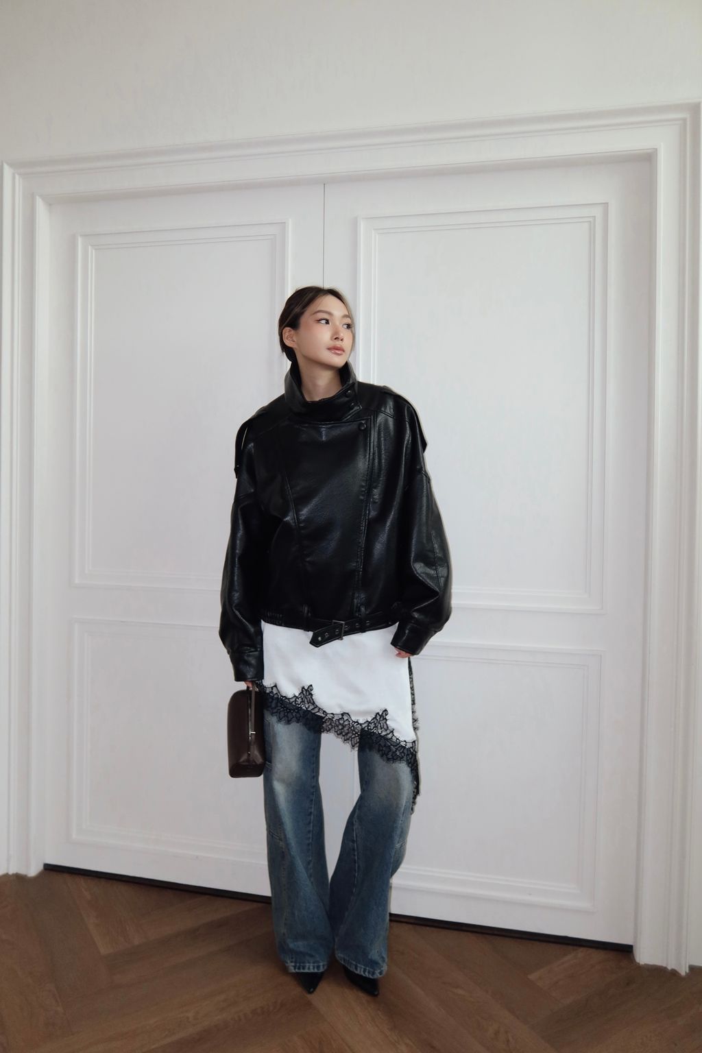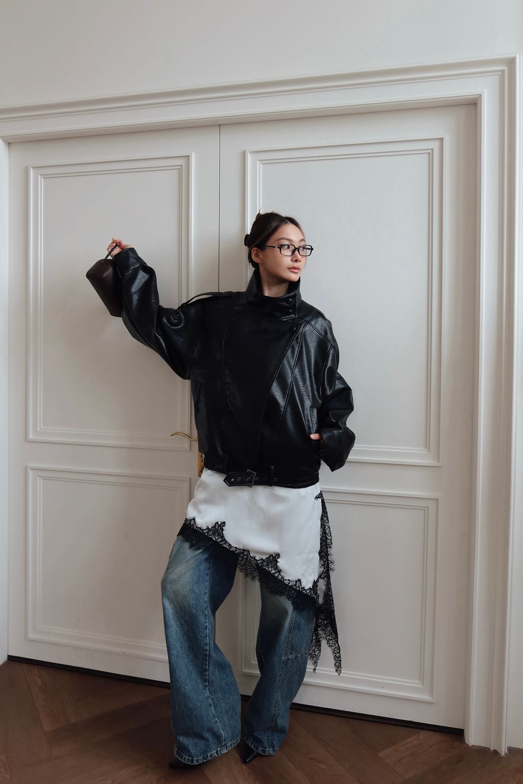 ・不對稱翻領、金屬釦、側拉鍊,搶眼卻不浮誇
