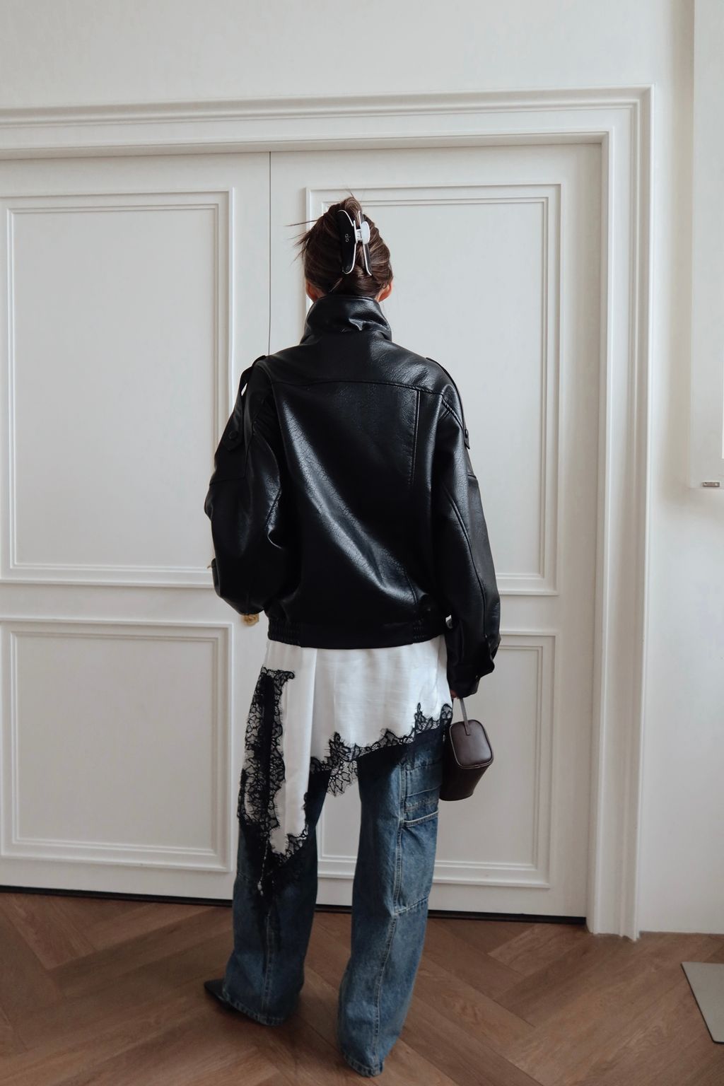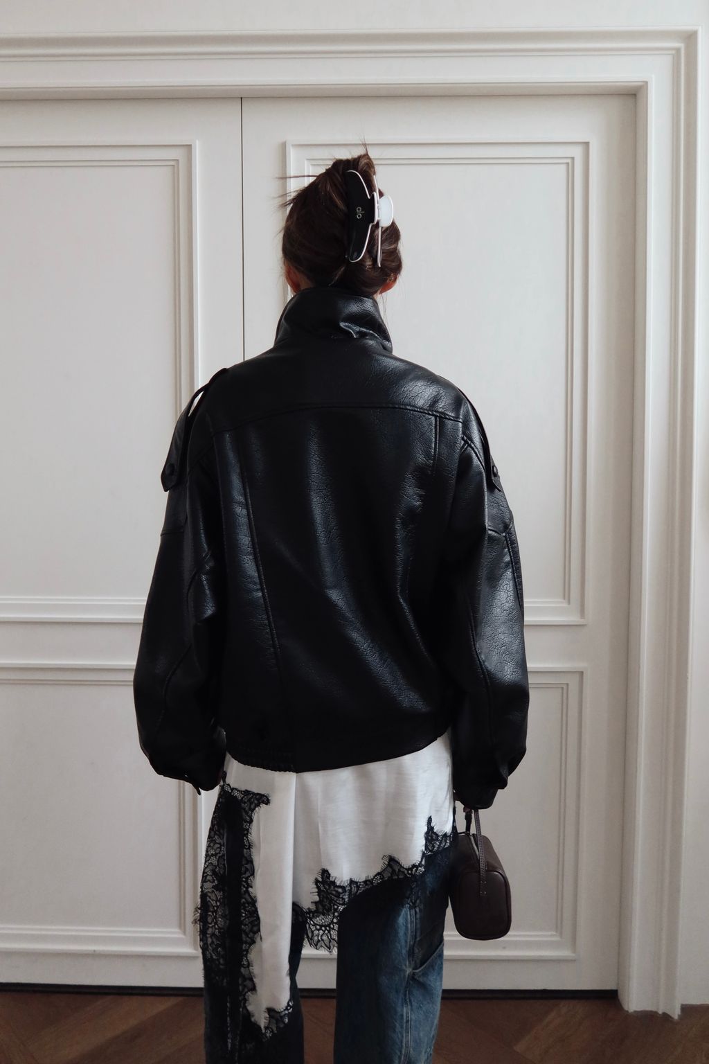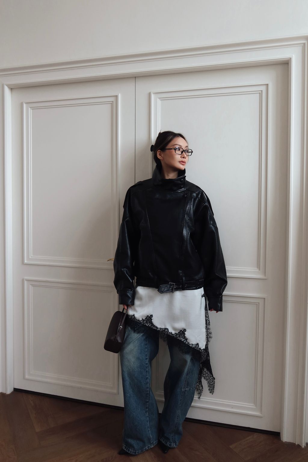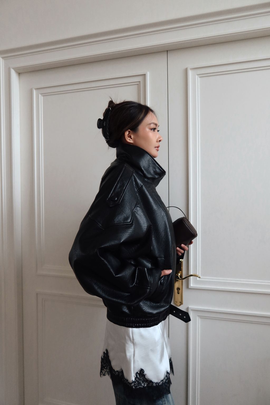 ・不對稱翻領、金屬釦、側拉鍊,搶眼卻不浮誇
