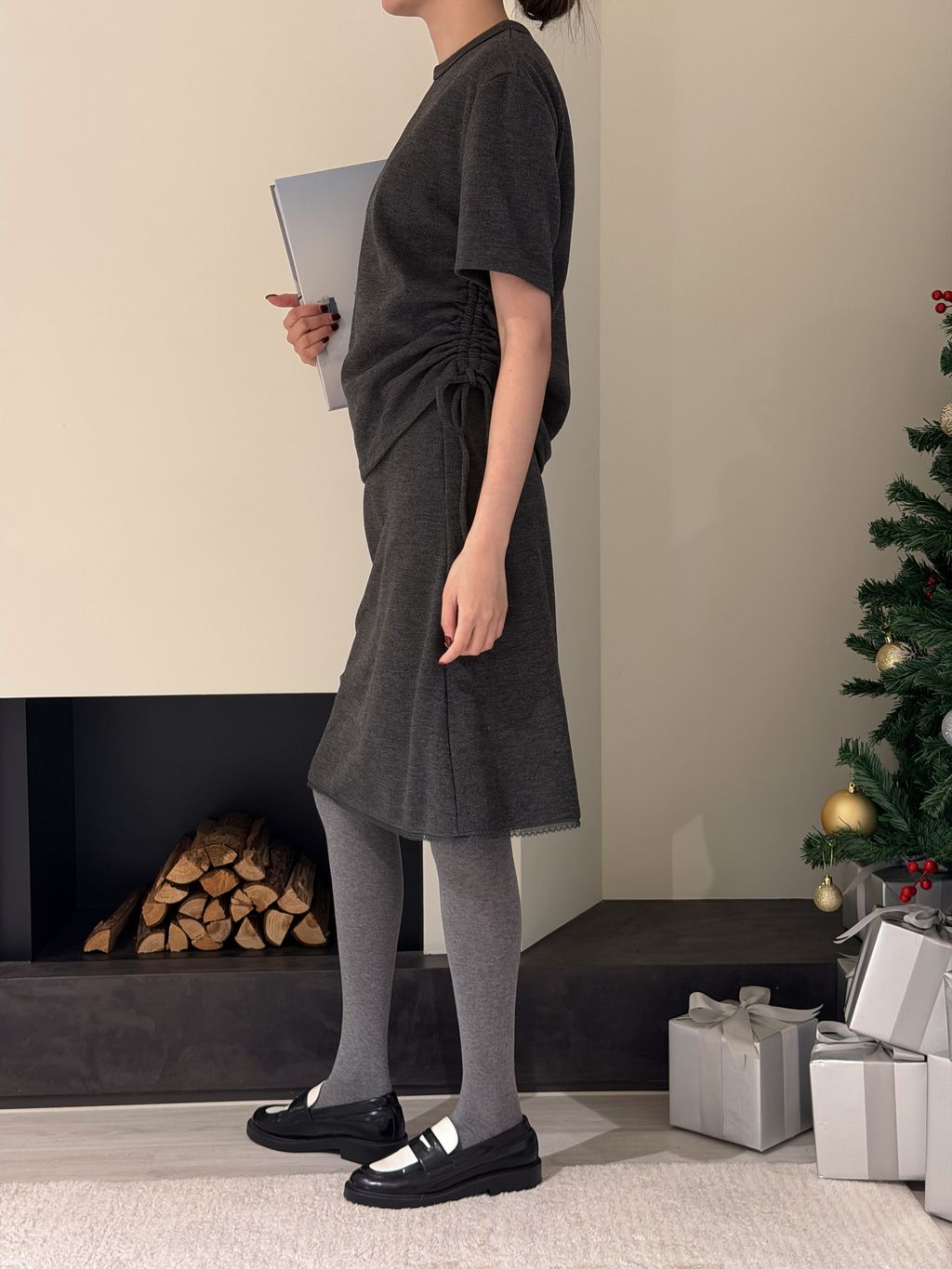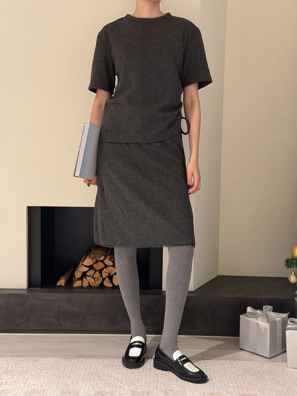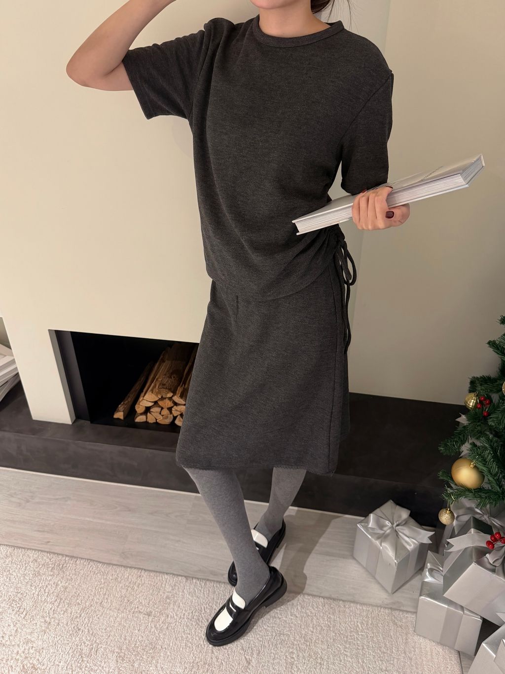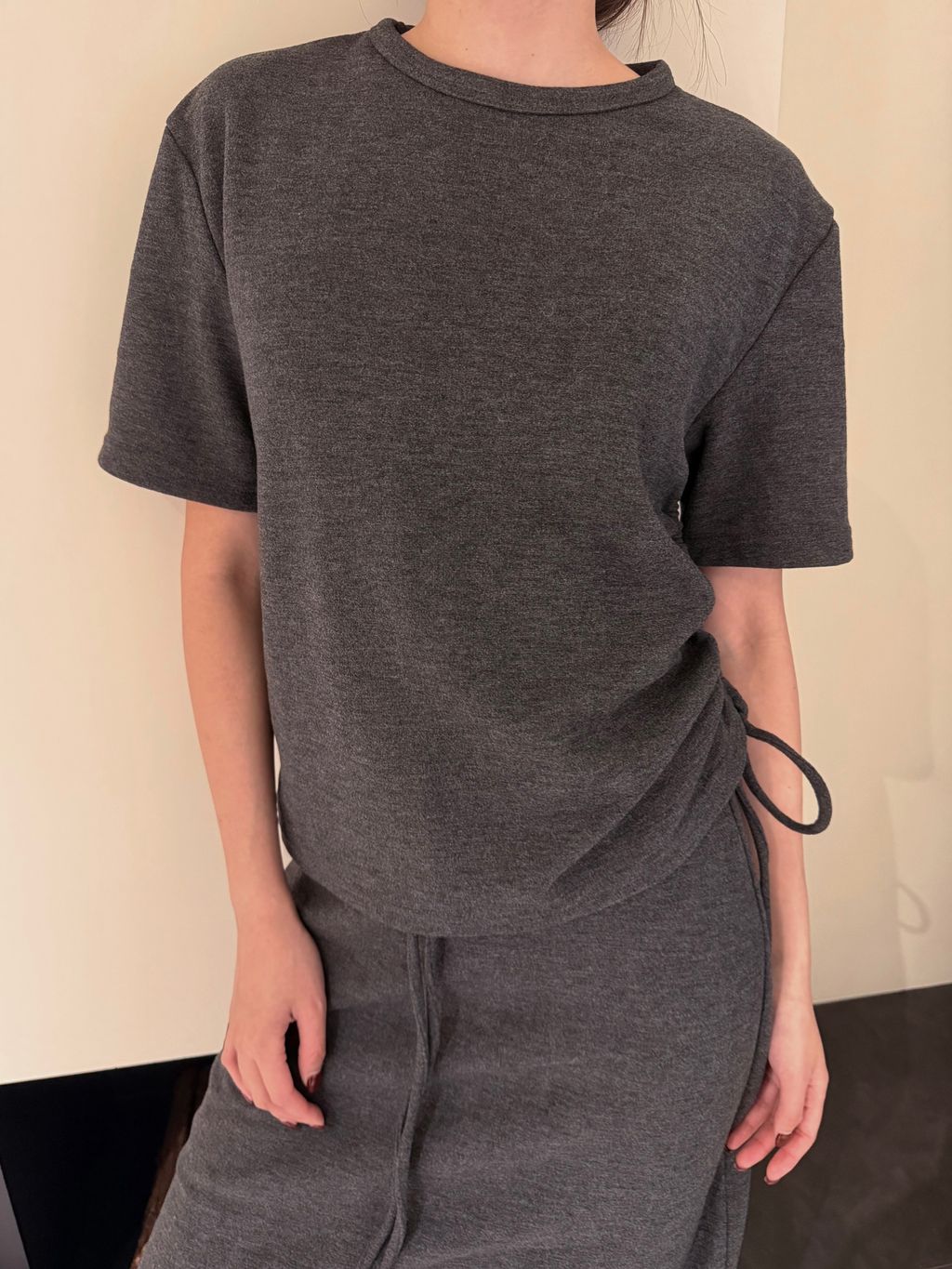 • 上衣側邊抓皺設計,搭配綁帶細節,可依喜好調整造型