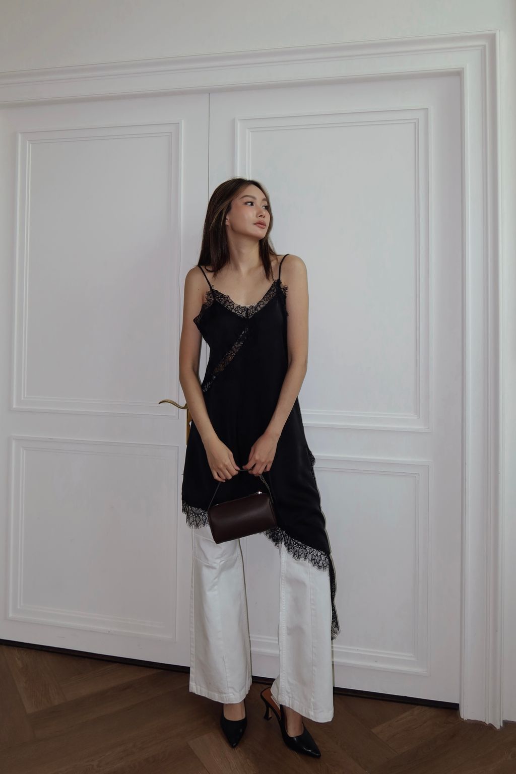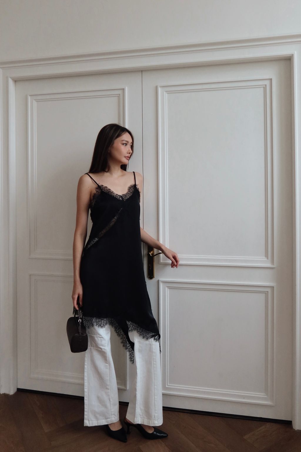 法式設計感蕾絲細肩背心- 黑