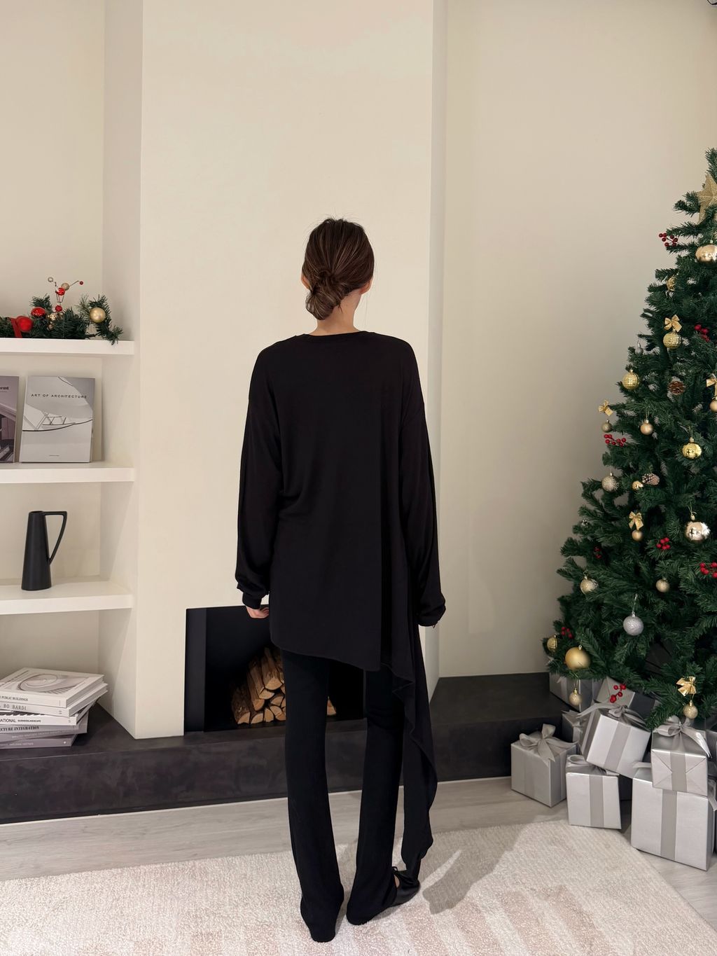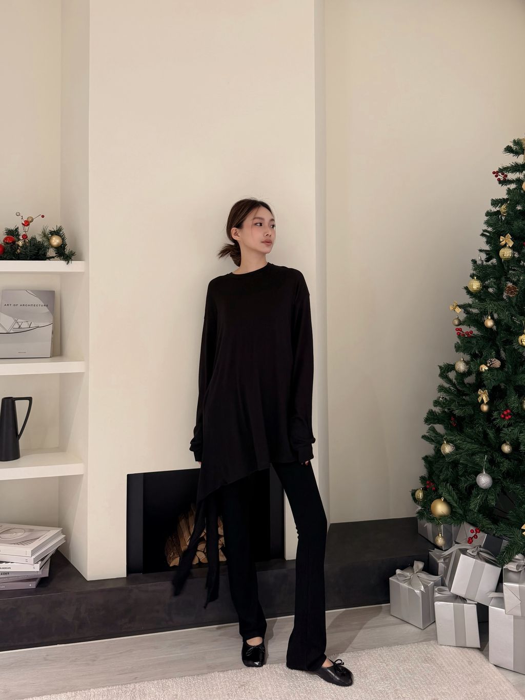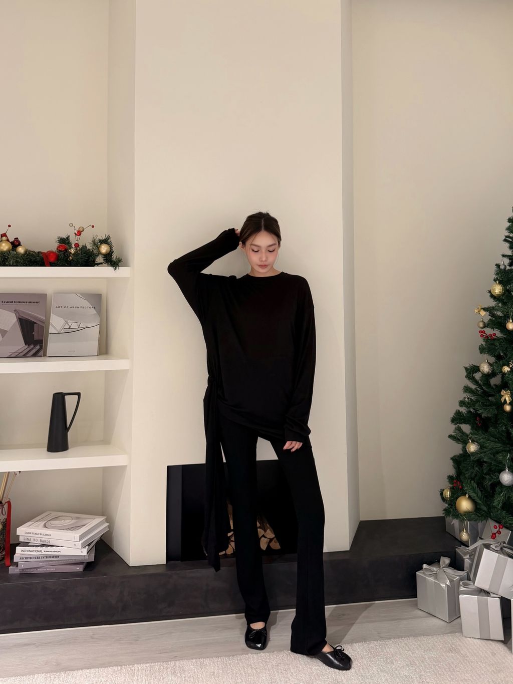 • 上衣不對稱綁帶細節,增添層次感與修身效果