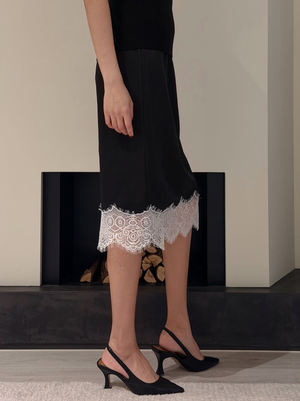 法式蕾絲花邊緞面裙-黑